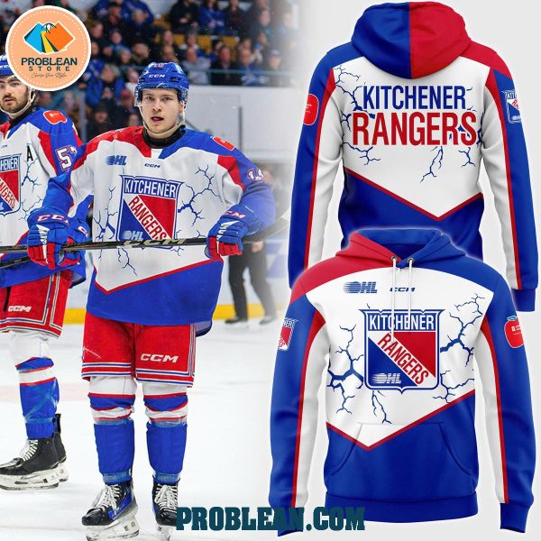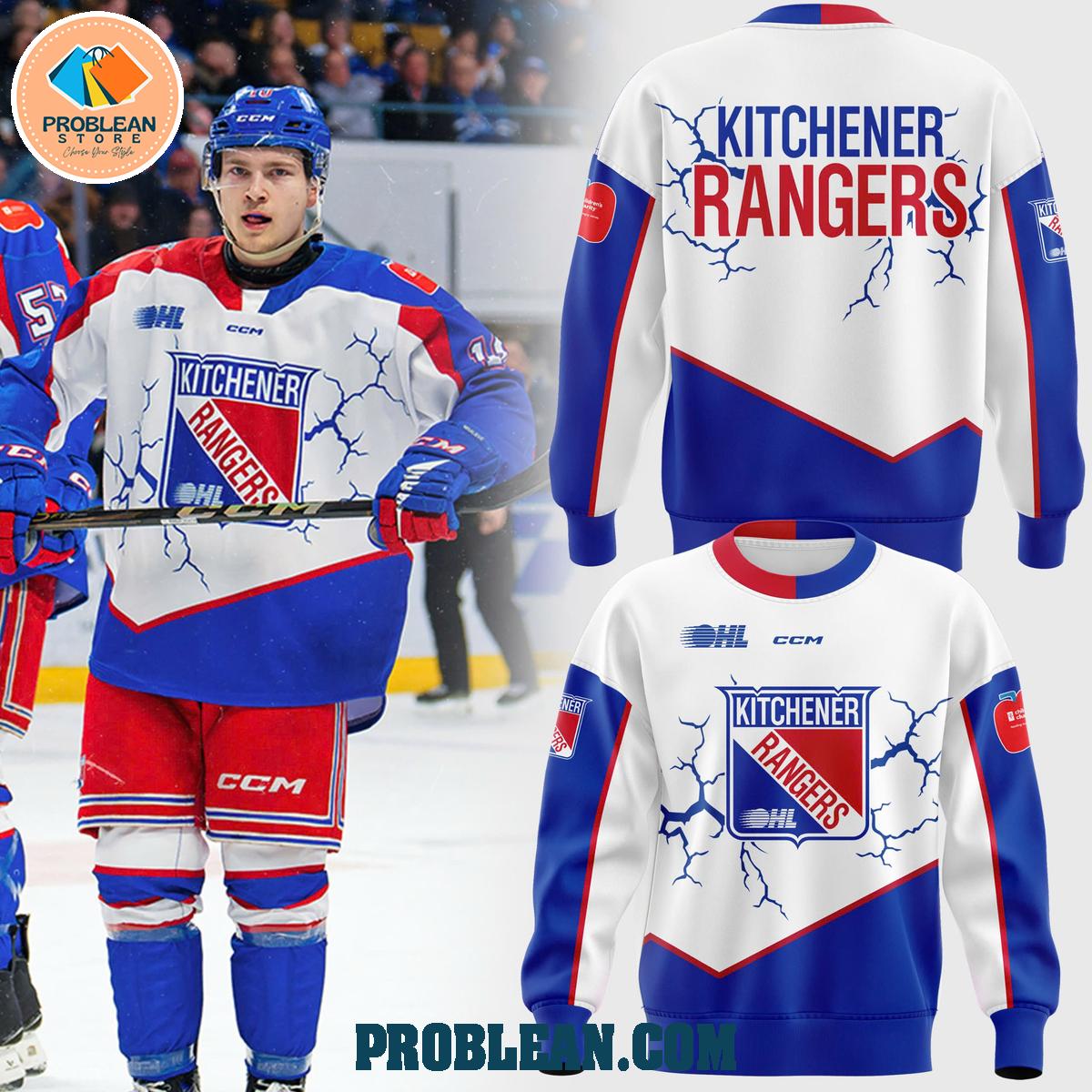 The Kitchener Rangers Uniform 2025 Hoodie & T-Shirt is the perfect fan gear for those who want to showcase their passion for OHL hockey in style. Designed to replicate the 2025 Kitchener Rangers jersey, this hoodie and T-shirt feature the team’s bold blue, red, and white colors, complete with lightning-inspired crack effects that add a modern and energetic touch. The official Kitchener Rangers logo is proudly displayed on the front, making this apparel a standout piece for any devoted fan.