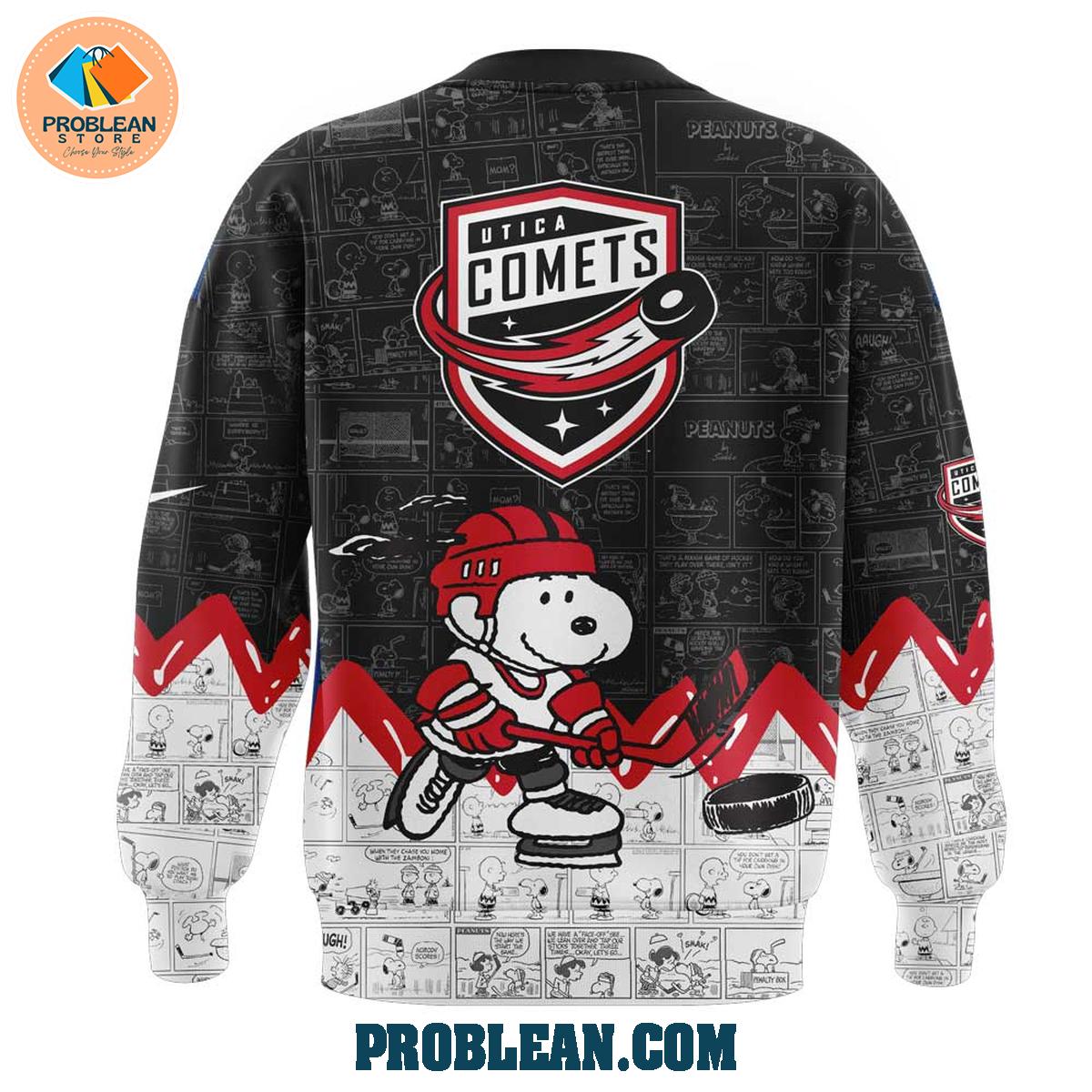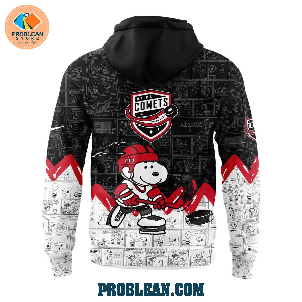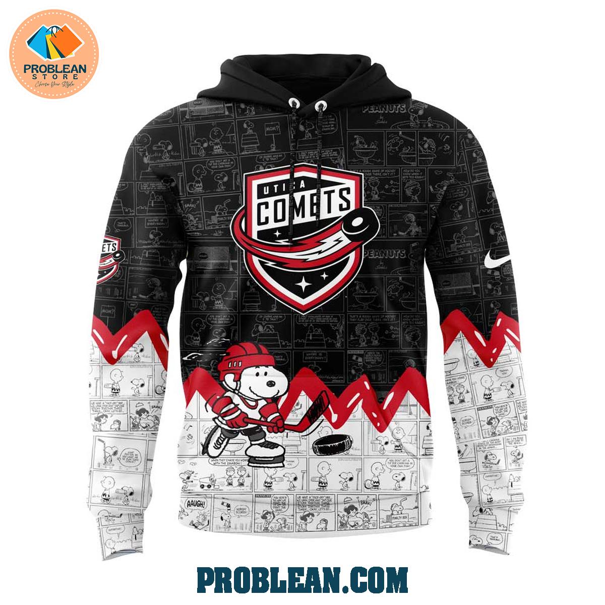 Designed with a sleek black background, this hoodie features classic Peanuts comic strip panels, paying tribute to Charles Schulz’s iconic artwork. The Utica Comets logo is prominently displayed on the front and back, reinforcing team spirit while seamlessly blending with the Peanuts Night theme. At the bottom, Snoopy is featured in full hockey gear, dressed in Utica Comets’ red, black, and white colors, skating across the design and capturing the energy of the game.