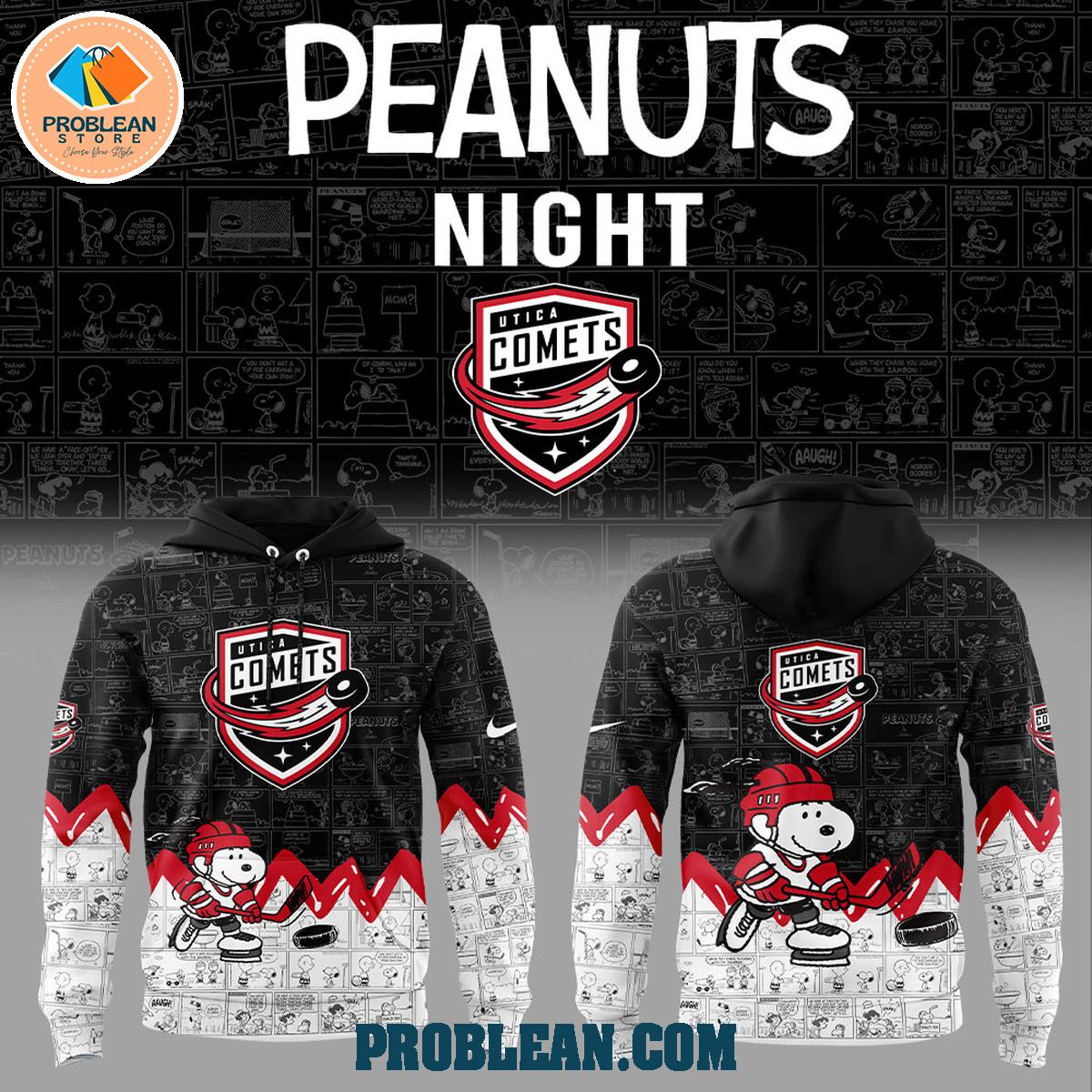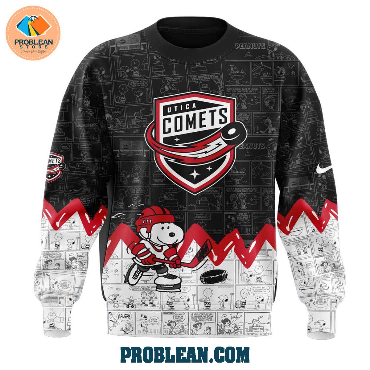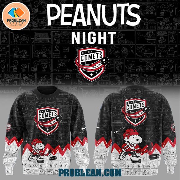 Designed with a sleek black background, this hoodie features classic Peanuts comic strip panels, paying tribute to Charles Schulz’s iconic artwork. The Utica Comets logo is prominently displayed on the front and back, reinforcing team spirit while seamlessly blending with the Peanuts Night theme. At the bottom, Snoopy is featured in full hockey gear, dressed in Utica Comets’ red, black, and white colors, skating across the design and capturing the energy of the game.